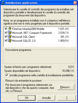 - nella finestra di Installazione applicazioni dell'ActiveSync che le compare selezionare una per volta le componenti Fimesan Infantia2000 Mobile, Microsoft .NET Compact Framework, Microsoft SQL Client e Microsoft SQL CE 2.0 e faccia clic su Rimuovi attendendo il completamento delle operazioni